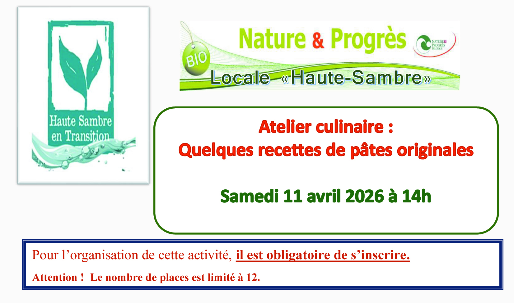 Haute Sambre en transition et la locale Haute Sambre de Nature et Progrès sont heureux de vous inviter à un atelier culinaire axé sur les pâtes. Attention ! Le nombre de places est limité à 12.