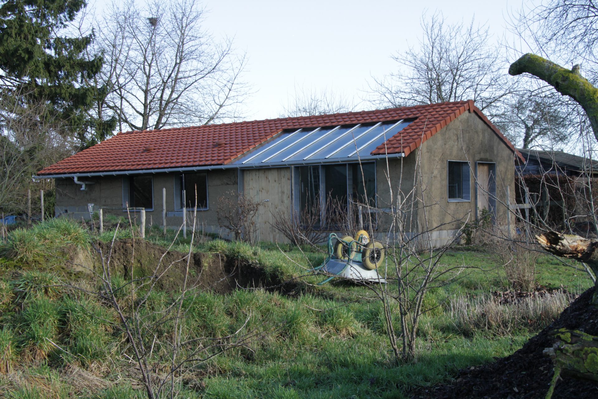 Le bâtiment (12,5m x 5,5m) se compose de trois volumes: une verrière, un atelier/stockage et des réservoirs d’eau de pluie. Les murs (19 cm d’épaisseur) sont constitués d’une ossature en bois noyée dans de la terre (la terre du jardin mélangée à du sable et de la chénevotte de chanvre).